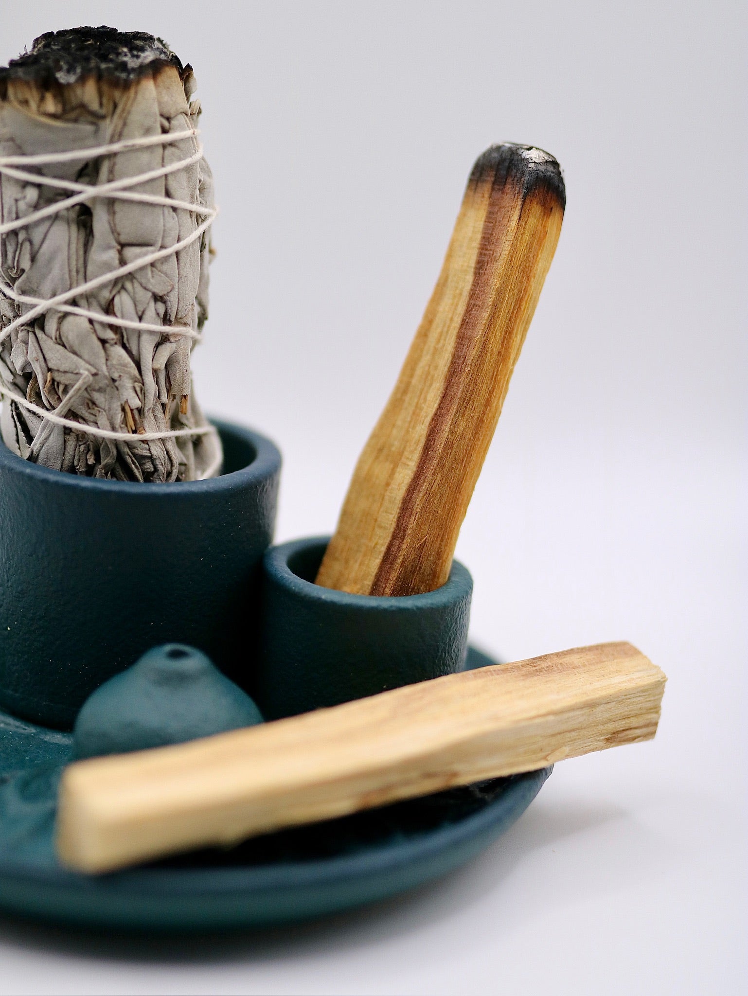 Dieses Set vereint die kraftvolle Reinigung des Weißen Salbei mit dem warmen, balsamischen Duft des Palo Santo.