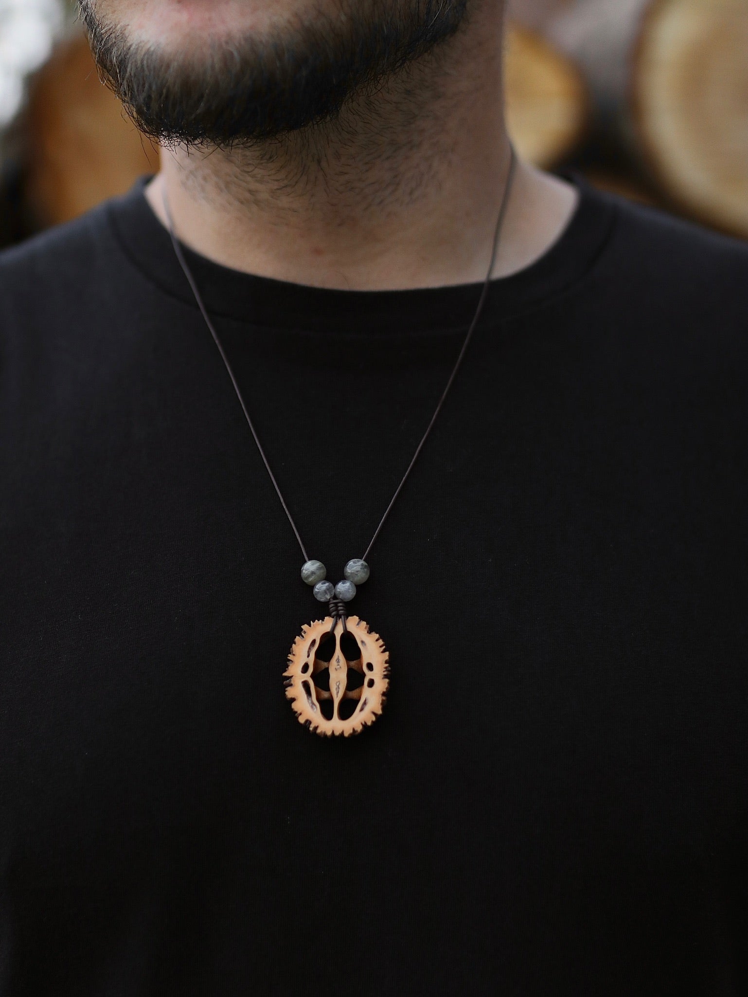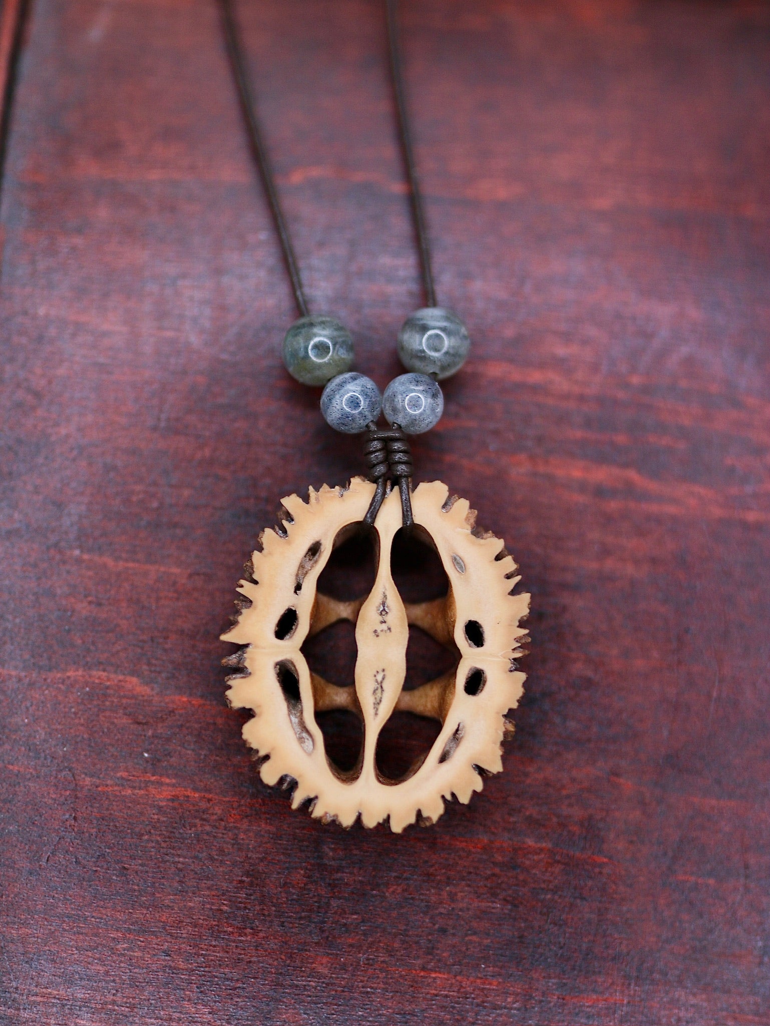 Dieses Schwarznuss-Amulett wurde sorgfältig von Hand geschnitten, geschliffen und geölt.